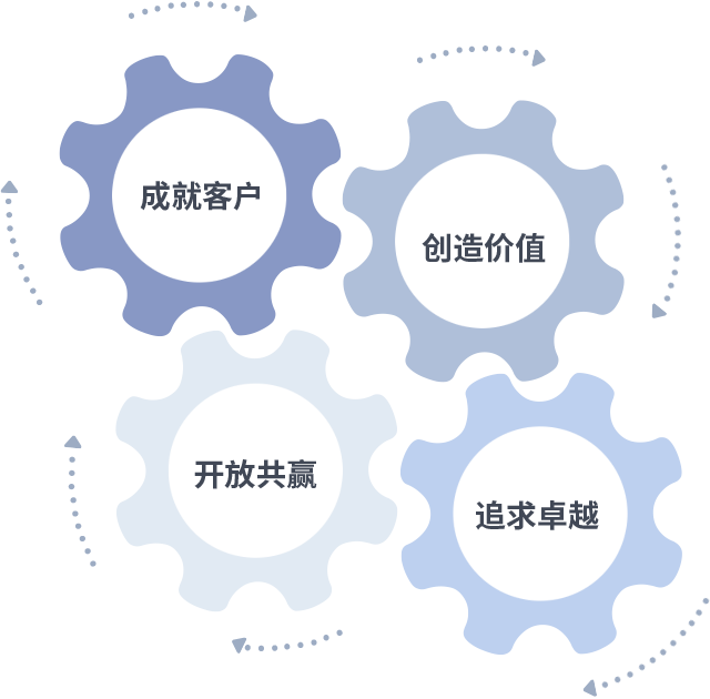 成就客户是一切决策的出发点,创造价值是衡量所有工作的标准,追求卓越是永信贵宾会217做事做人的态度,开放共赢是永信贵宾会217的格局也是最终的结果。价值观的齿轮环环相扣,推动着组织里的每个人不断向前。